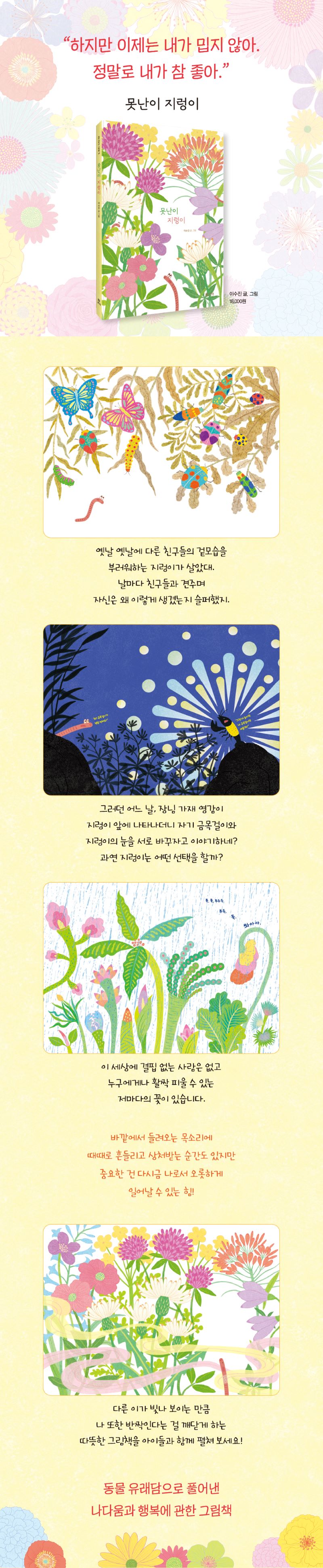 작가는 새롭게 바꾸어 쓴 결말을 통해 어리석은 선택을 하고 상처를 받더라도 끝이 아니라고 이야기합니다. 지렁이의 어리석은 모습은 진짜 ‘나’를 찾아가는 모습이라고 바꾸어 말합니다. 부딪히고 헤매며 스스로 깨닫는 시간이 없다면 결코 찾을 수 없으니까요. 중요한 건 다시금 나로서 오롯하게 일어날 수 있는 힘! 아직 보지 못했지만 내 안에 깃든 반짝임을 믿는다면 ‘상처’를 양분 삼아 나다움을 반드시 피워낼 거라고, ‘미운 나’도 받아들이고 자유로워질 거라고 힘주어 말합니다. 바깥에서 들려오는 목소리에 때때로 흔들리고 상처받을 수밖에 없습니다. 그러나 상처를 딛고 한 발짝 나아간다면 더 성장한 나와 마주할 수 있지요. 이처럼 저마다의 꽃들이 색색으로 환하게 피어나길 응원하는 이야기는 아이들에게 따뜻한 길잡이가 되어 줄 것입니다.