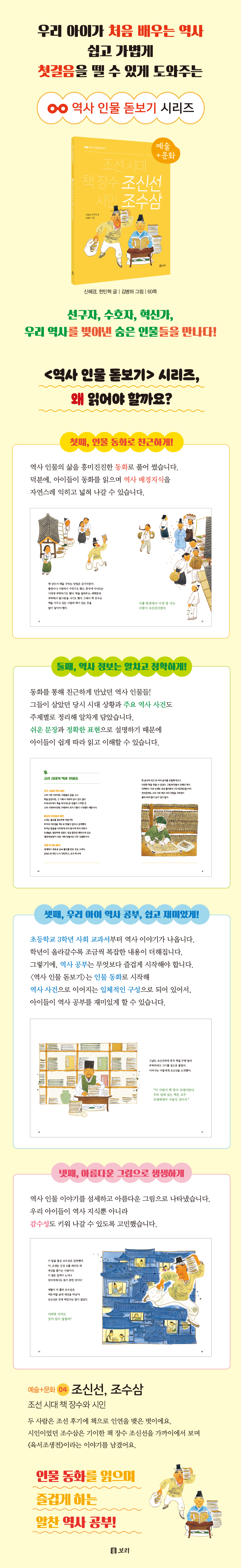 우리 역사를 빚어낸 숨은 인물들을 만나는 <역사 인물 돋보기: 예술+문화> 시리즈입니다. 흥미진진한 인물 동화를 통해 어린이들이 역사 공부 첫걸음을 쉽고 가볍게 뗄 수 있도록 도와줍니다. 시리즈 네 번째 책에서는 우리나라의 예술과 문화를 다채롭게 만든 인물 가운데 책과 이야기를 나누며 특별한 벗이 된 조신선과 조수삼을 소개합니다.