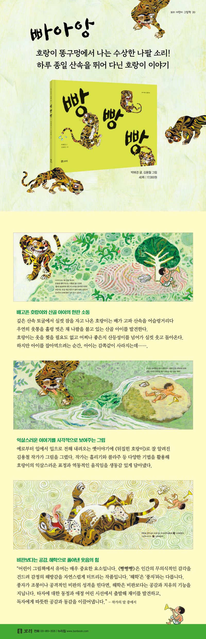 응큼하지만 어수룩한 호랑이와 재치 있는 산골 아이가 펼치는 옛이야기 그림책 《빵빵빵》이 새로 나왔다. 깊은 산속 토굴에서 실컷 잠을 자고 나온 호랑이는 배가 고파 산속을 어슬렁거리다 우연히 웃통을 훌렁 벗은 채 나팔을 불고 있는 산골 아이를 발견한다. 옷을 찢을 필요도 없이 손쉽게 잡아먹을 수 있겠다 싶어 좋아하던 호랑이는 산등성이를 넘어가 실컷 웃고 돌아온다. 하지만 막상 아이를 잡아먹으려는 순간, 아이는 어느새 감쪽같이 사라지고 만다. 단순하지만 익살스러운 전개 속에서 호랑이의 어수룩함과 아이의 재치가 유쾌한 웃음을 자아낸다.