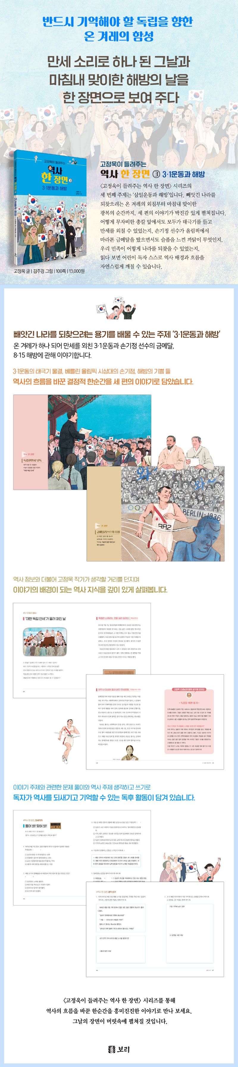 <고정욱이 들려주는 역사 한 장면③-3·1운동과 해방>은 역사 이야기와 함께 다양한 지식 정보를 담고 있습니다. 민족자결주의와 2·8독립선언이 3·1운동에 불을 지핀 과정, 나치 정치 선전의 장이 되어 버린 베를린 올림픽, 해방 직후 여운형이 이끈 건국 준비 위원회의 활동까지 이야기에서 다룬 사건의 시대 상황과 주요 개념을 체계적으로 정리하여, 어린이 독자가 이야기와 관련된 역사 상식을 쉽고 편하게 배울 수 있습니다.